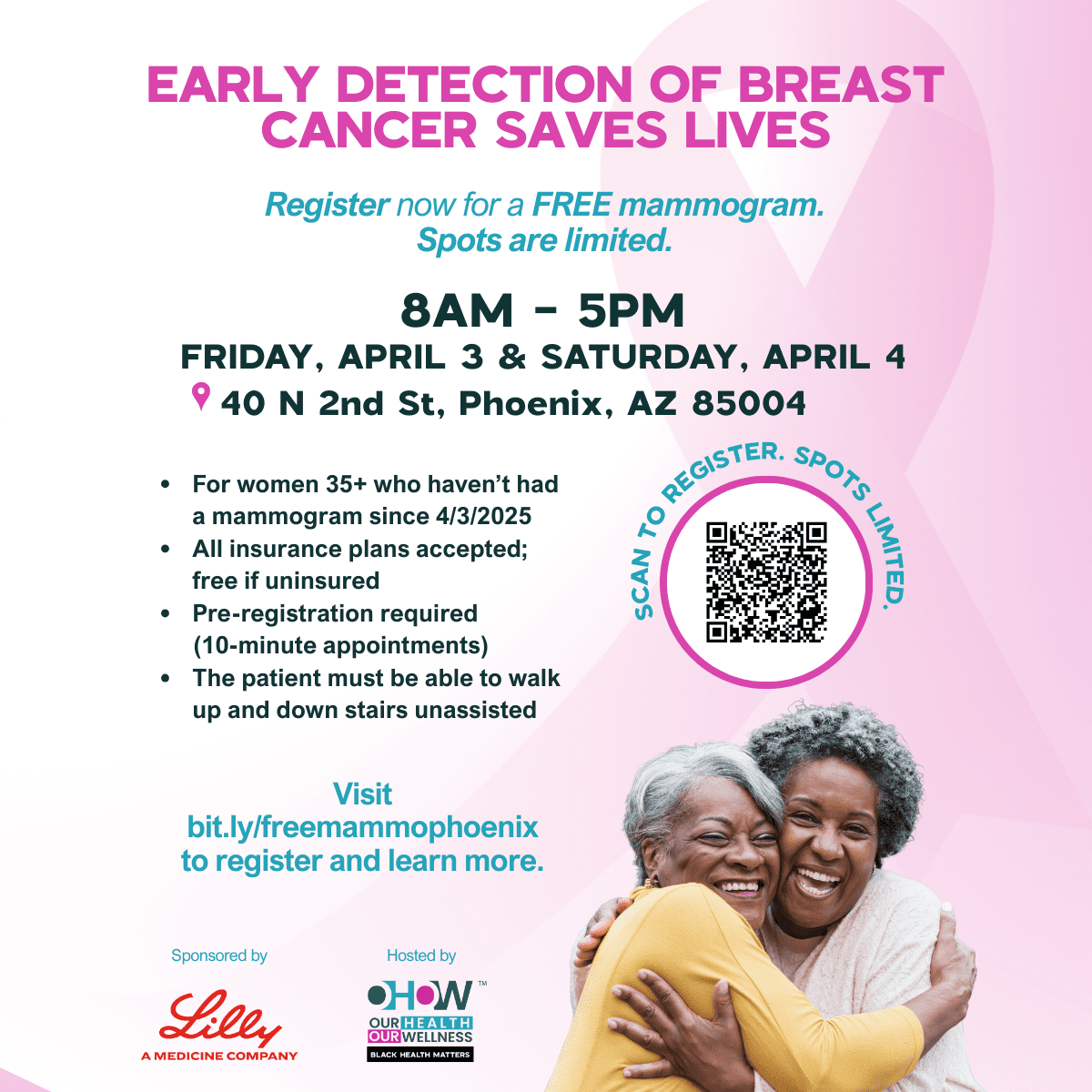 To help make screening more accessible, Black Health Matters through OHOW is once again partnering with Eli Lilly and Company to host a two-day mammogram screening event. This event will take place April 3-4 from 8 AM to 5 PM in Phoenix, Arizona. It will provide women an opportunity to take action and prioritize screening while learning more about the importance of early detection.